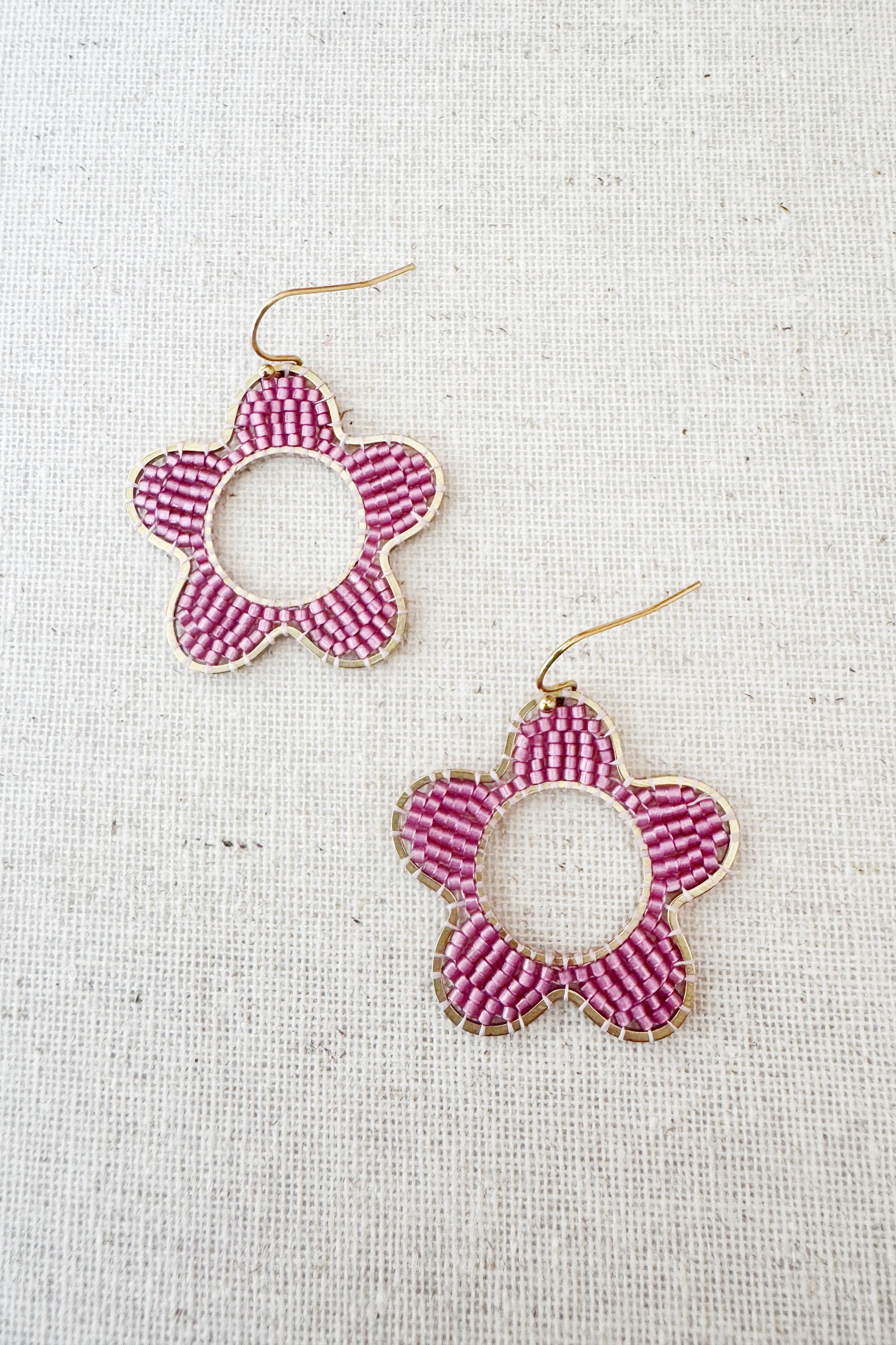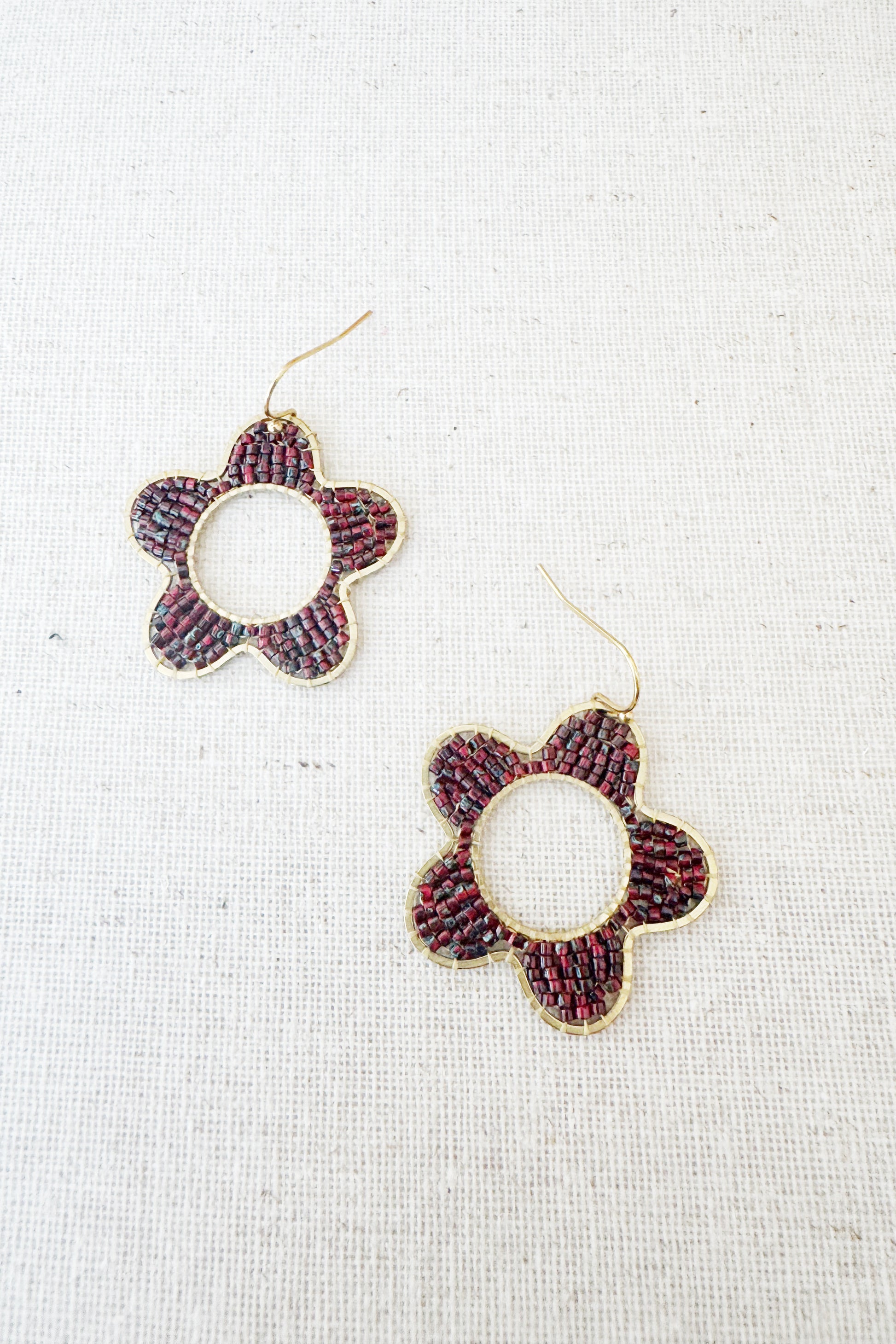 Raw Brass frame hand beaded with Japanese glass beads on nylon thread. Gold plated hooks, nickel free.