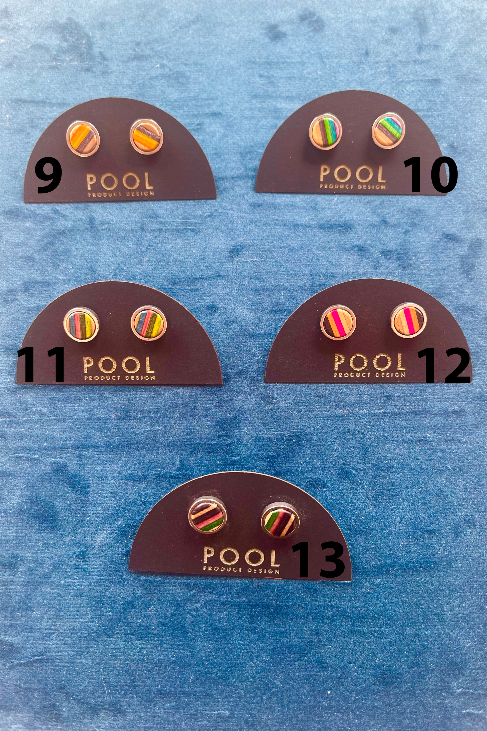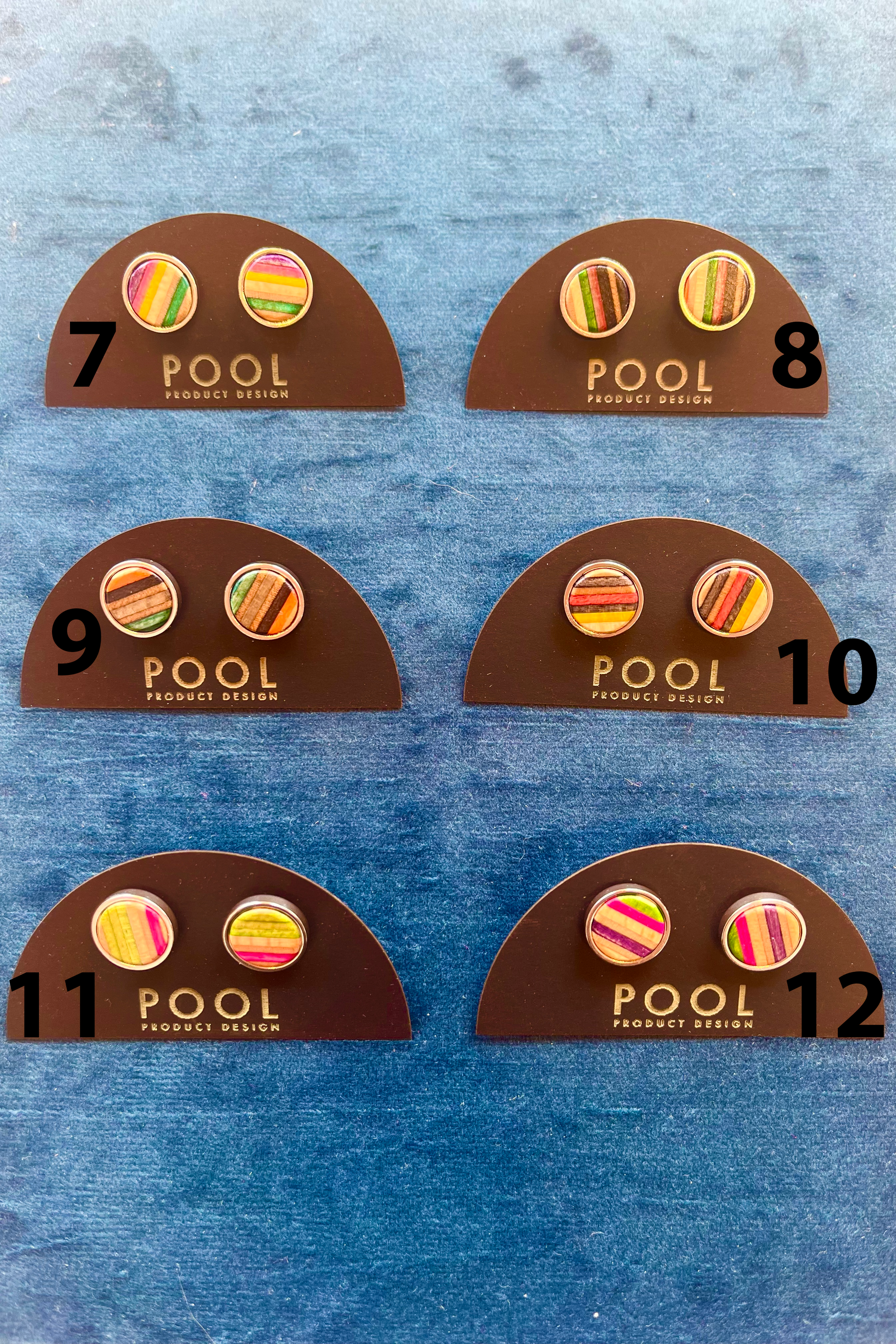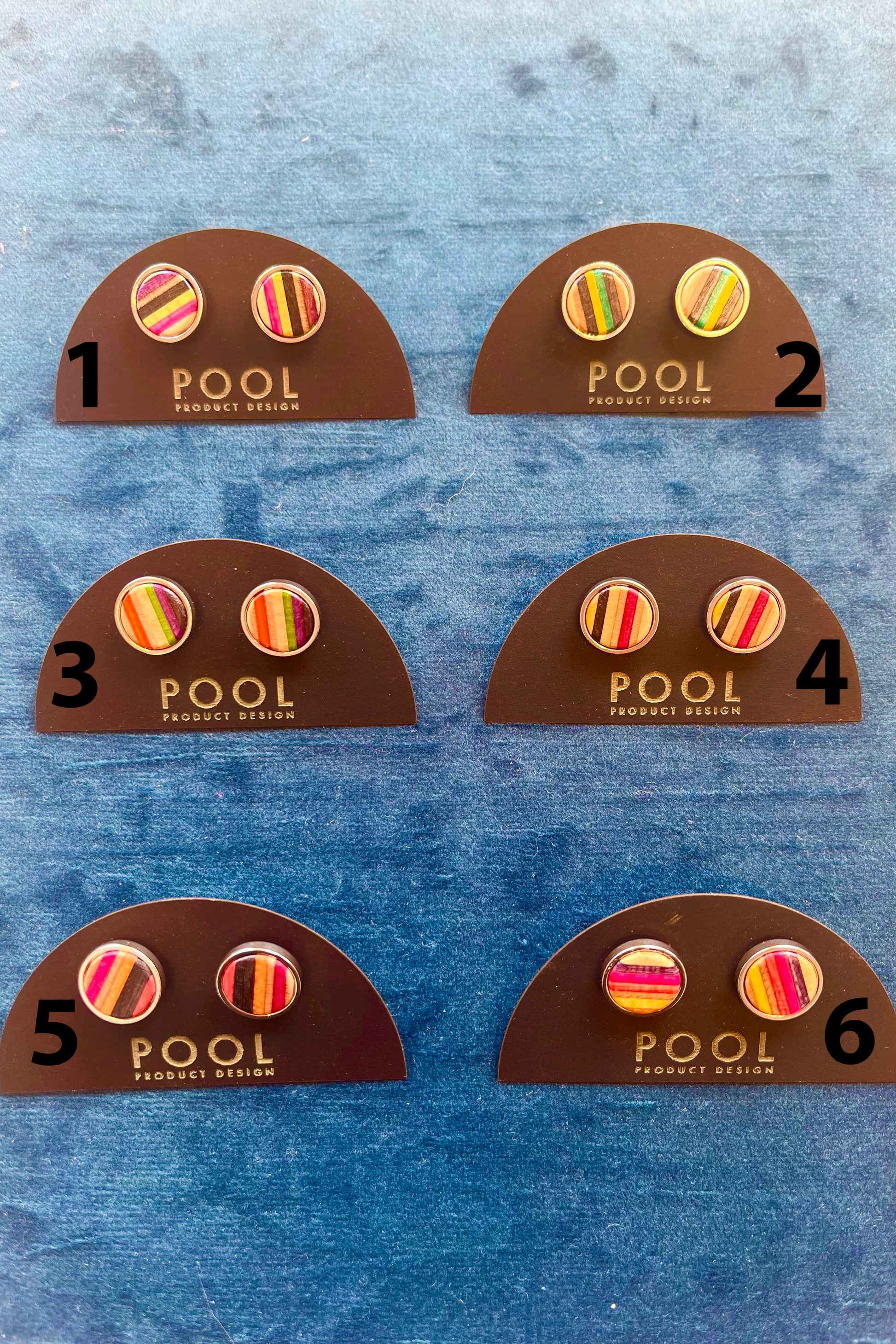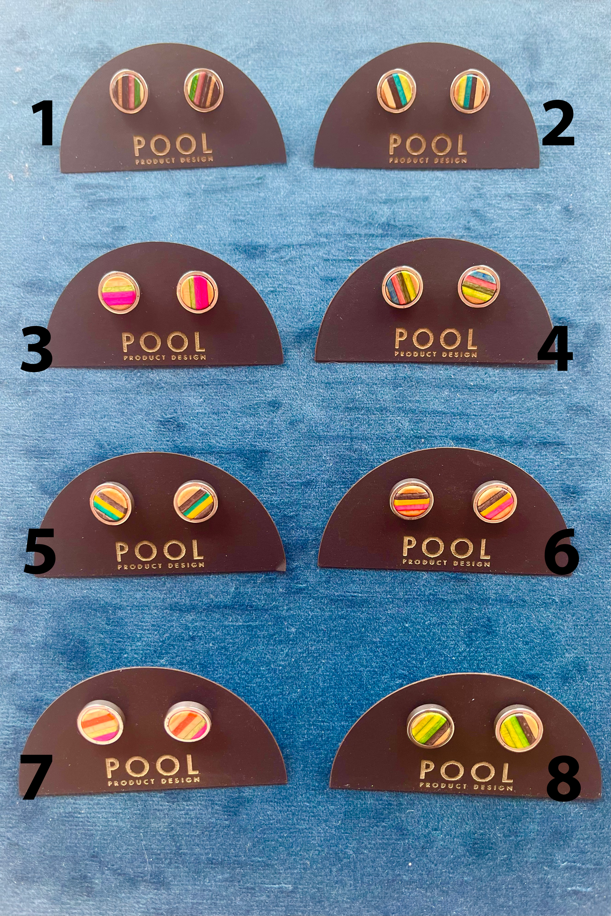 Colourful round stud earrings made from repurposed skateboards that nests in stainless steel. These earrings will add a nice splash of colour to any outfit